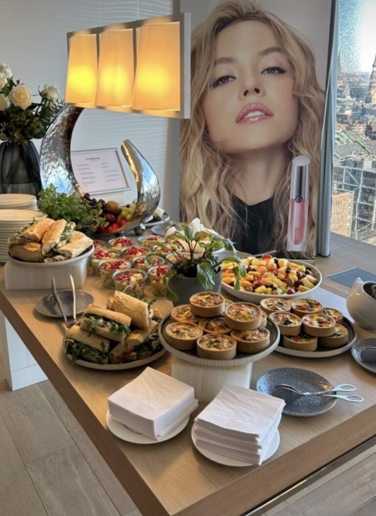 Ein gedeckter Tisch voller Früchte, Tartes, Brote – Symbole der Fülle und Gastfreundschaft. Im Hintergrund blickt eine Frau mit klarer Ruhe und sinnlicher Stärke auf den Betrachter – ihr Antlitz, eingefasst in ein Werbeplakat, erinnert an die Bildsprache alter Meisterporträts und gleichzeitig an die glatte Ästhetik heutiger Luxuswelt. Die warmen Goldtöne tauchen das Bild in eine beinahe sakrale Lichtstimmung, während der Kontrast zwischen Konsum und Klassik Fragen aufwirft: